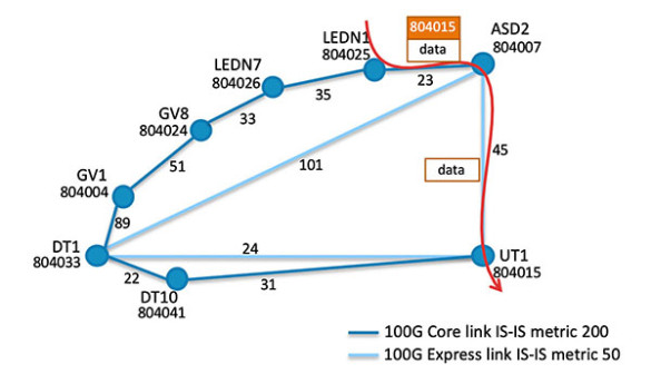 Segment Routing kan eenvoudig worden toegepast in een MPLS-netwerk, de SR-instructieset wordt met MPLS-labels opgebouwd. Allereerst krijgen elke node en elke link (voor beide richtingen) een segment identifier (SID) toegewezen. Deze zogenaamde adjacency SID’s voor linken en de node SID’s voor nodes staan getekend in figuur 1 en worden door de IGP (IS-IS in SURFnet8) gedistribueerd. Alle routers in het netwerk verwerken deze SID’s in de lokale topologiedatabase en hebben daarmee een compleet overzicht van het gehele netwerk.
